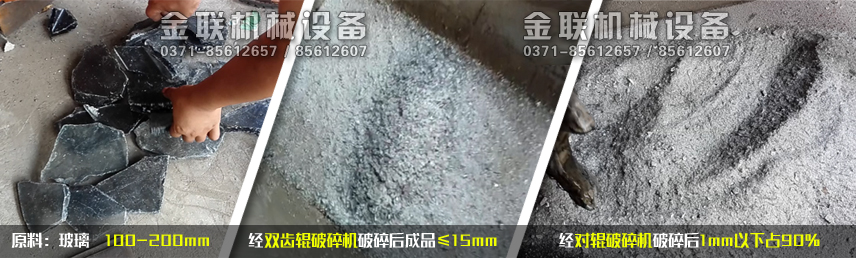 玻璃破碎效果實拍(圖片中雙齒輥破碎機采用長條齒破碎,不同的進料和出粒要求,使用不同的齒形)